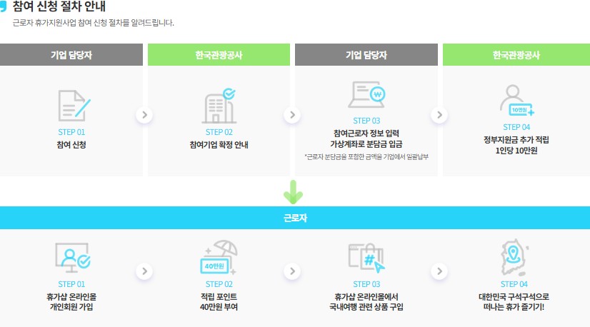 - 휴가지원 사업 참여 여부 확인: 중소기업 근로자는 별도로 신청해야 추가 지원 가능
